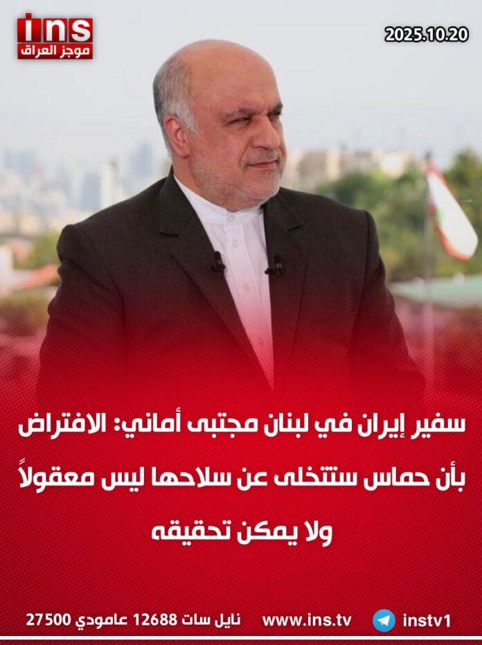 الرئيسيةالأخبارسفير إيران في لبنان مجتبى أماني: الافتراض بأن حماس ستتخلى عن سلاحها... الأخبار سفير إيران في لبنان مجتبى أماني: الافتراض بأن حماس ستتخلى عن سلاحها ليس معقولاً ولا يمكن تحقيقه 0 33 أكتوبر 19, 2025 كتب بواسطة موجز العراق ins شارك FacebookTwitterPinterestWhatsAppTelegramViberCopy URL شارك FacebookTwitterPinterestWhatsAppTelegramViberCopy URL مقالات ذات صلة الأخبار غارة جوية إسرائيلية تستهدف سيارة في بلدة حاروف جنوبي لبنان أكتوبر 25, 2025 الأخبار وزارة الخزانة الأمريكية تعلن عن عقوبات اقتصادية على الرئيس الكولومبي غوستافو بيترو وعائلته وشركائه لدورهم في تهريب المخدرات أكتوبر 24, 2025 الأخبار مجموعة العمل المالي ” اف اي تي اف” في أحدث بيان لها: لا تزال إيران مدرجة على القائمة السوداء للدول عالية المخاطر في مجال... أكتوبر 24, 2025
