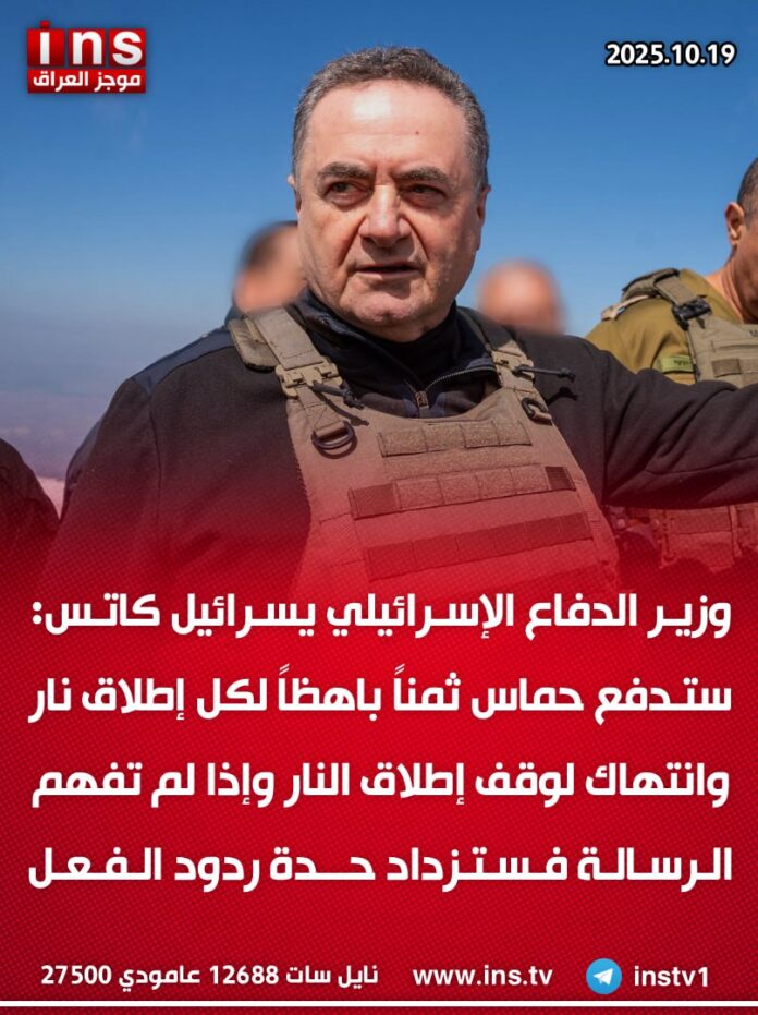 الرئيسيةالأخباروزير الدفاع الإسرائيلي يسرائيل كاتس: ستدفع حماس ثمناً باهظاً لكل إطلاق نار... الأخبار وزير الدفاع الإسرائيلي يسرائيل كاتس: ستدفع حماس ثمناً باهظاً لكل إطلاق نار وانتهاك لوقف إطلاق النار وإذا لم تفهم الرسالة فستزداد حدة ردود الفعل 0 28 أكتوبر 19, 2025 كتب بواسطة موجز العراق ins شارك FacebookTwitterPinterestWhatsAppTelegramViberCopy URL شارك FacebookTwitterPinterestWhatsAppTelegramViberCopy URL مقالات ذات صلة الأخبار الوكالة الدولية للطاقة الذرية: رصد نشاط بالقرب من مواقع مخزونات نووية في إيران أكتوبر 29, 2025 الأخبار المبعوثة الأمريكية إلى لبنان مورغان أورتاغوس: على الجيش اللبناني التنفيذ الكامل لقرار حصر السلاح بيد الدولة أكتوبر 29, 2025 الأخبار مجلة “ذا أتلانتك” الأمريكية: القرار الأخير لوزارة الخزانة الأمريكية بفرض عقوبات على شركة المهندس العامة واثنين من كبار رجال الأعمال العراقيين “عقيل مفتن وعلي... أكتوبر 29, 2025