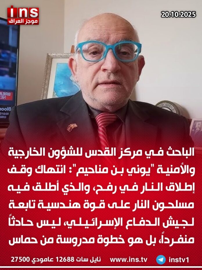الباحث في مركز القدس للشؤون الخارجية والأمنية “يوني بن مناحيم”: انتهاك وقف إطلاق النار في رفح، والذي أطلق فيه مسلحون النار على قوة هندسية تابعة لجيش الدفاع الإسرائيلي، ليس حادثاً منفرداً، بل هو خطوة مدروسة من حماس