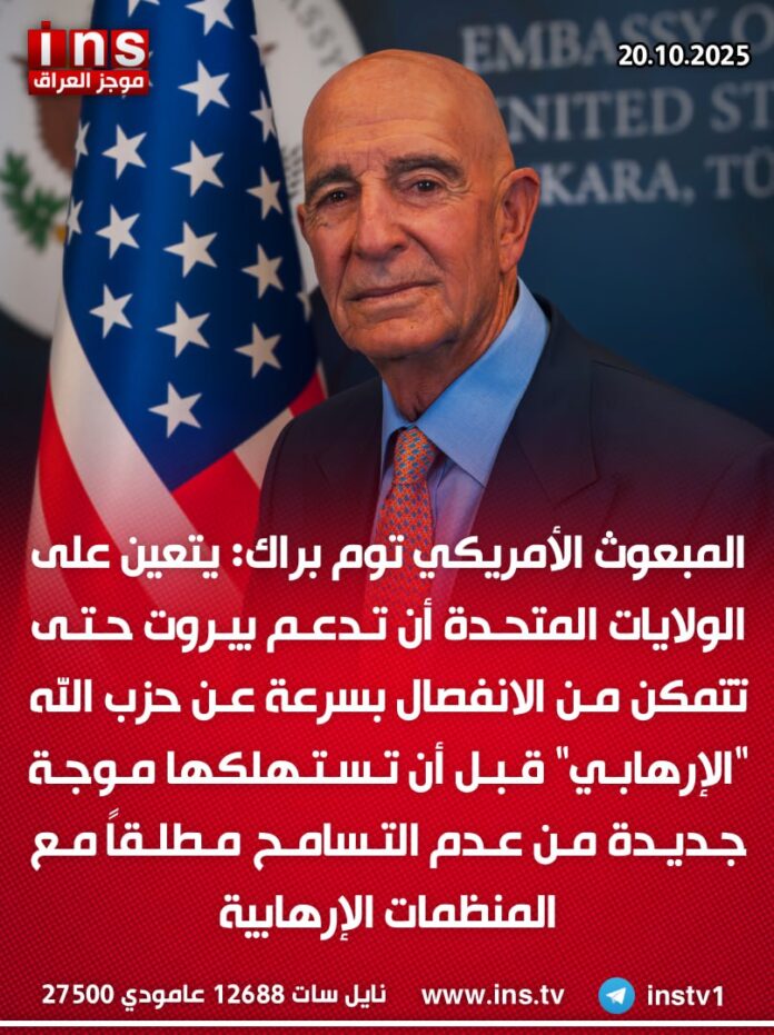 المبعوث الأمريكي توم براك: يتعين على الولايات المتحدة أن تدعم بيروت حتى تتمكن من الانفصال بسرعة عن حزب الله “الإرهابي” قبل أن تستهلكها موجة جديدة من عدم التسامح مطلقاً مع المنظمات الإرهابية