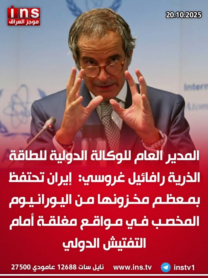 الرئيسيةالأخبارالمدير العام للوكالة الدولية للطاقة الذرية رافائيل غروسي: إيران تحتفظ بمعظم مخزونها... الأخبار المدير العام للوكالة الدولية للطاقة الذرية رافائيل غروسي: إيران تحتفظ بمعظم مخزونها من اليورانيوم المخصب في مواقع مغلقة أمام التفتيش الدولي 0 27 أكتوبر 20, 2025 كتب بواسطة موجز العراق ins شارك FacebookTwitterPinterestWhatsAppTelegramViberCopy URL شارك FacebookTwitterPinterestWhatsAppTelegramViberCopy URL مقالات ذات صلة الأخبار غارة جوية إسرائيلية تستهدف سيارة في بلدة حاروف جنوبي لبنان أكتوبر 25, 2025 الأخبار وزارة الخزانة الأمريكية تعلن عن عقوبات اقتصادية على الرئيس الكولومبي غوستافو بيترو وعائلته وشركائه لدورهم في تهريب المخدرات أكتوبر 24, 2025 الأخبار مجموعة العمل المالي ” اف اي تي اف” في أحدث بيان لها: لا تزال إيران مدرجة على القائمة السوداء للدول عالية المخاطر في مجال... أكتوبر 24, 2025