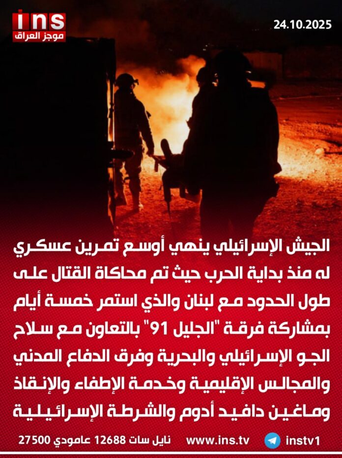 الجيش الإسرائيلي ينهي أوسع تمرين عسكري له منذ بداية الحرب حيث تم محاكاة القتال على طول الحدود مع لبنان والذي استمر خمسة أيام بمشاركة فرقة “الجليل 91” بالتعاون مع سلاح الجو الإسرائيلي والبحرية وفرق الدفاع المدني والمجالس الإقليمية وخدمة الإطفاء والإنقاذ وماغين دافيد أدوم والشرطة الإسرائيلية