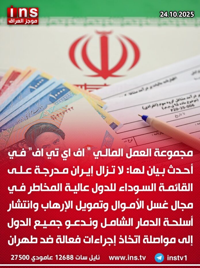 الرئيسيةالأخبارمجموعة العمل المالي " اف اي تي اف" في أحدث بيان لها:... الأخبار مجموعة العمل المالي ” اف اي تي اف” في أحدث بيان لها: لا تزال إيران مدرجة على القائمة السوداء للدول عالية المخاطر في مجال غسل الأموال وتمويل الإرهاب وانتشار أسلحة الدمار الشامل وندعو جميع الدول إلى مواصلة اتخاذ إجراءات فعالة ضد طهران 0 9 أكتوبر 24, 2025 كتب بواسطة موجز العراق ins شارك FacebookTwitterPinterestWhatsAppTelegramViberCopy URL شارك FacebookTwitterPinterestWhatsAppTelegramViberCopy URL مقالات ذات صلة الأخبار وزارة الخزانة الأمريكية تعلن عن عقوبات اقتصادية على الرئيس الكولومبي غوستافو بيترو وعائلته وشركائه لدورهم في تهريب المخدرات أكتوبر 24, 2025 الأخبار وزارة الحرب الأمريكية: حاملة الطائرات “يو إس إس جيرالد ر. فورد” والمجموعة الضاربة التابعة لها تتجه إلى منطقة مسؤولية القيادة الجنوبية الأمريكية بالقرب من... أكتوبر 24, 2025 الأخبار مقتل عنصر من منظمة حزب الله الإرهابية بغارة إسرائيلية قرب زوطر الغربية في جنوب لبنان أكتوبر 24, 2025