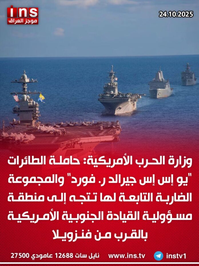 وزارة الحرب الأمريكية: حاملة الطائرات “يو إس إس جيرالد ر. فورد” والمجموعة الضاربة التابعة لها تتجه إلى منطقة مسؤولية القيادة الجنوبية الأمريكية بالقرب من فنزويلا