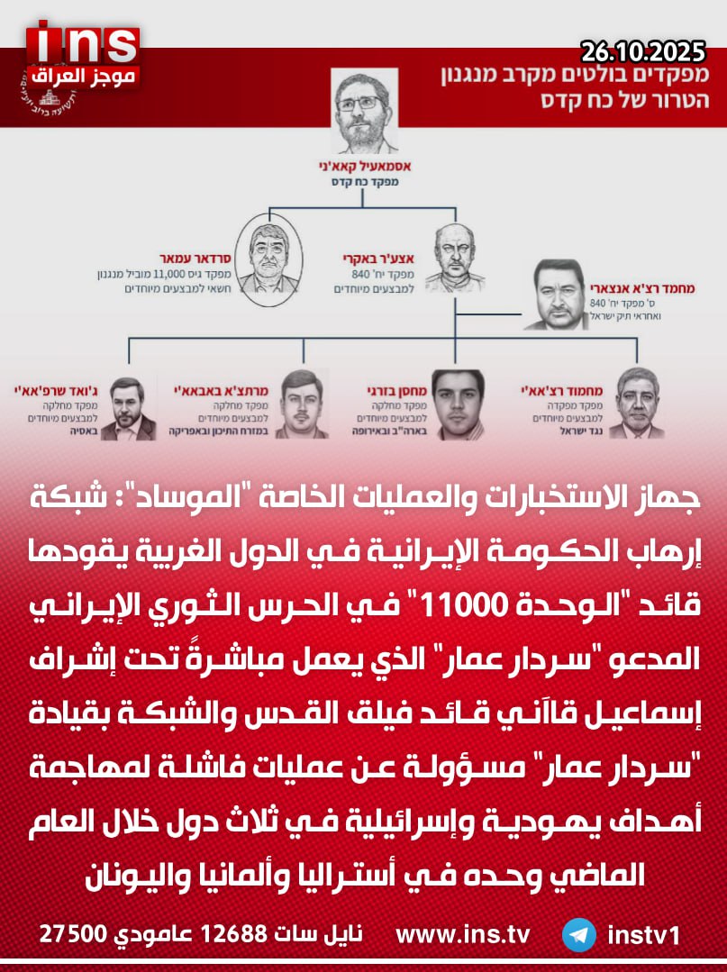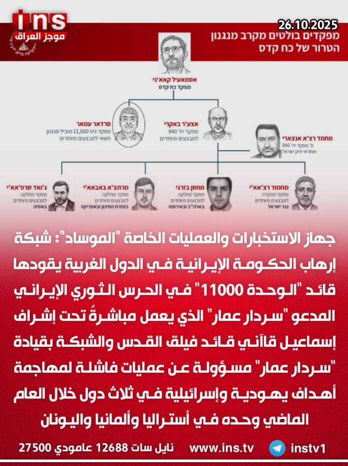 جهاز الاستخبارات والعمليات الخاصة “الموساد”: شبكة إرهاب الحكومة الإيرانية في الدول الغربية يقودها قائد “الوحدة 11000” في الحرس الثوري الإيراني المدعو “سردار عمار” الذي يعمل مباشرةً تحت إشراف إسماعيل قاآني، قائد فيلق القدس والشبكة بقيادة “سردار عمار” مسؤولة عن عمليات فاشلة لمهاجمة أهداف يهودية وإسرائيلية في ثلاث دول خلال العام الماضي وحده في أستراليا وألمانيا واليونان