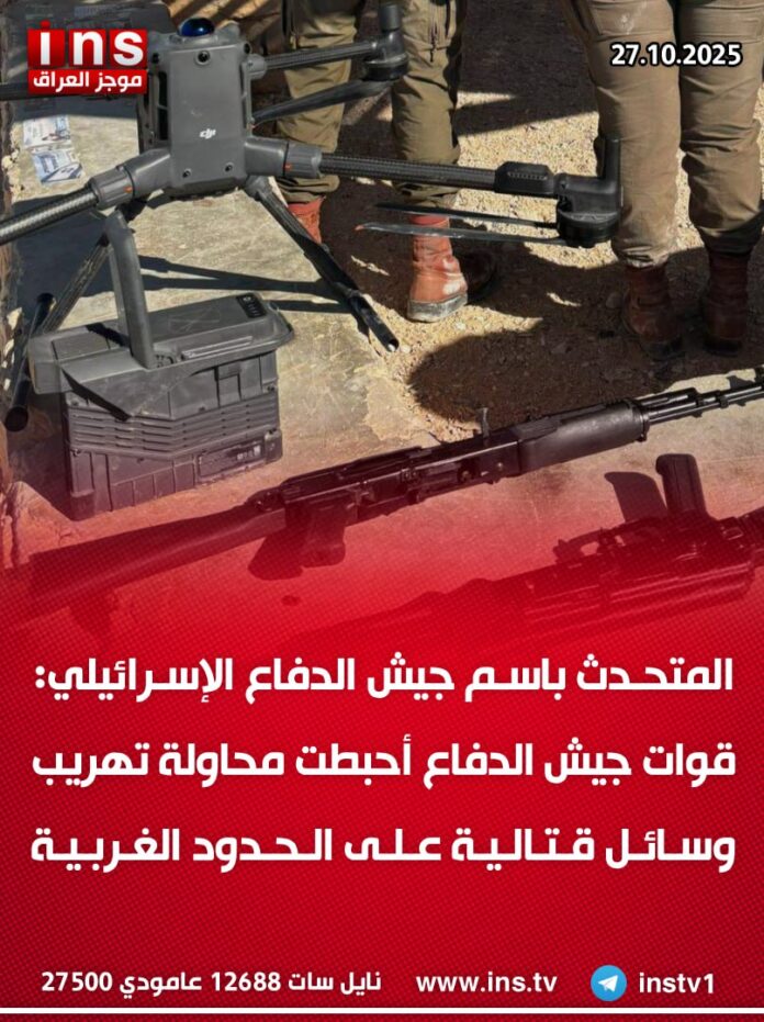 الرئيسيةالأخبارالمتحدث باسم جيش الدفاع الإسرائيلي: قوات جيش الدفاع أحبطت محاولة تهريب وسائل... الأخبار المتحدث باسم جيش الدفاع الإسرائيلي: قوات جيش الدفاع أحبطت محاولة تهريب وسائل قتالية على الحدود الغربية 0 12 أكتوبر 27, 2025 كتب بواسطة موجز العراق ins شارك FacebookTwitterPinterestWhatsAppTelegramViberCopy URL شارك FacebookTwitterPinterestWhatsAppTelegramViberCopy URL مقالات ذات صلة الأخبار مسؤول إسرائيلي: سنصل قريباً إلى نقطة الحسم بشأن تنفيذ عملية عسكرية في لبنان أكتوبر 27, 2025 الأخبار نيويورك بوست: الحشد الشعبي يتلقى 3 مليارات دولار سنوياً لتمويل 238 ألف مقاتل لكن الأعداد الحقيقية لا تتجاوز 48 ألفاً فقط فيما تذهب رواتب... أكتوبر 27, 2025 الأخبار وزير الداخلية في الحكومة الشرعية اليمنية “إبراهيم حيدان”: إيران قامت بنقل أنشطة تهريب المخدرات والأسلحة إلى اليمن بعد سقوط نظام بشار الأسد في سوريا أكتوبر 27, 2025