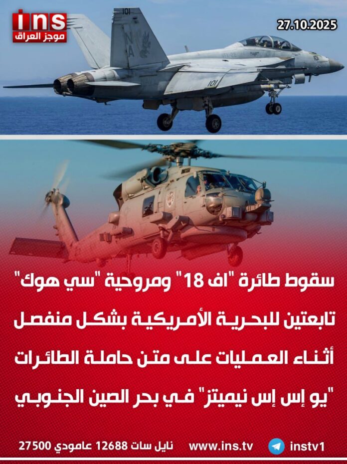 الرئيسيةالأخبارسقوط طائرة "اف 18" ومروحية "سي هوك" تابعتين للبحرية الأمريكية بشكل منفصل... الأخبار سقوط طائرة “اف 18” ومروحية “سي هوك” تابعتين للبحرية الأمريكية بشكل منفصل أثناء العمليات على متن حاملة الطائرات “يو إس إس نيميتز” في بحر الصين الجنوبي 0 11 أكتوبر 27, 2025 كتب بواسطة موجز العراق ins شارك FacebookTwitterPinterestWhatsAppTelegramViberCopy URL شارك FacebookTwitterPinterestWhatsAppTelegramViberCopy URL مقالات ذات صلة الأخبار مسؤول إسرائيلي: سنصل قريباً إلى نقطة الحسم بشأن تنفيذ عملية عسكرية في لبنان أكتوبر 27, 2025 الأخبار نيويورك بوست: الحشد الشعبي يتلقى 3 مليارات دولار سنوياً لتمويل 238 ألف مقاتل لكن الأعداد الحقيقية لا تتجاوز 48 ألفاً فقط فيما تذهب رواتب... أكتوبر 27, 2025 الأخبار المتحدث باسم جيش الدفاع الإسرائيلي: قوات جيش الدفاع أحبطت محاولة تهريب وسائل قتالية على الحدود الغربية أكتوبر 27, 2025