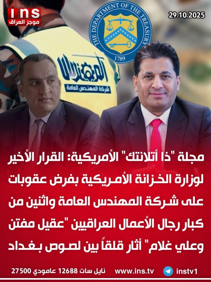 مجلة “ذا أتلانتك” الأمريكية: القرار الأخير لوزارة الخزانة الأمريكية بفرض عقوبات على شركة المهندس العامة واثنين من كبار رجال الأعمال العراقيين “عقيل مفتن وعلي غلام” أثار قلقاً بين لصوص بغداد