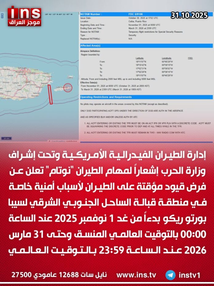 إدارة الطيران الفيدرالية الأمريكية وتحت إشراف وزارة الحرب إشعاراً لمهام الطيران “نوتام” تعلن عن فرض قيود مؤقتة على الطيران لأسباب أمنية خاصة في منطقة قبالة الساحل الجنوبي الشرقي لسيبا بورتو ريكو بدءاً من غد 1 نوفمبر 2025 عند الساعة 00:00 بالتوقيت العالمي المنسق وحتى 31 مارس 2026 عند الساعة 23:59 بالتوقيت العالمي