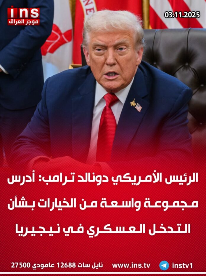 الرئيسيةالأخبارالرئيس الأمريكي دونالد ترامب: أدرس مجموعة واسعة من الخيارات بشأن التدخل العسكري... الأخبار الرئيس الأمريكي دونالد ترامب: أدرس مجموعة واسعة من الخيارات بشأن التدخل العسكري في نيجيريا 0 11 نوفمبر 3, 2025 كتب بواسطة موجز العراق ins شارك FacebookTwitterPinterestWhatsAppTelegramViberCopy URL شارك FacebookTwitterPinterestWhatsAppTelegramViberCopy URL مقالات ذات صلة الأخبار النائب سعود الساعدي عن نتائج التحقيق بمخالفات في محافظة البصرة يكشف عن قيام محافظ البصرة اسعد العيداني بسرقة مبلغ مقدارة 4 تريليون و500 مليار... نوفمبر 3, 2025 الأخبار مقتل عنصر في منظمة حزب الله الإرهابية يدعى يوسف سرور بمسيرة إسرائيلية استهدفت دراجته النارية في قرية عيتا الشعب بلبنان نوفمبر 3, 2025 الأخبار مبعوث الرئيس ترامب للشؤون الأفريقية: إدارة الرئيس ترامب اقترحت خطة لوقف الحرب بالسودان، وتلقينا موافقة مبدئية ورد إيجابي من طرفي الصراع، خصوصاً من جانب... نوفمبر 3, 2025