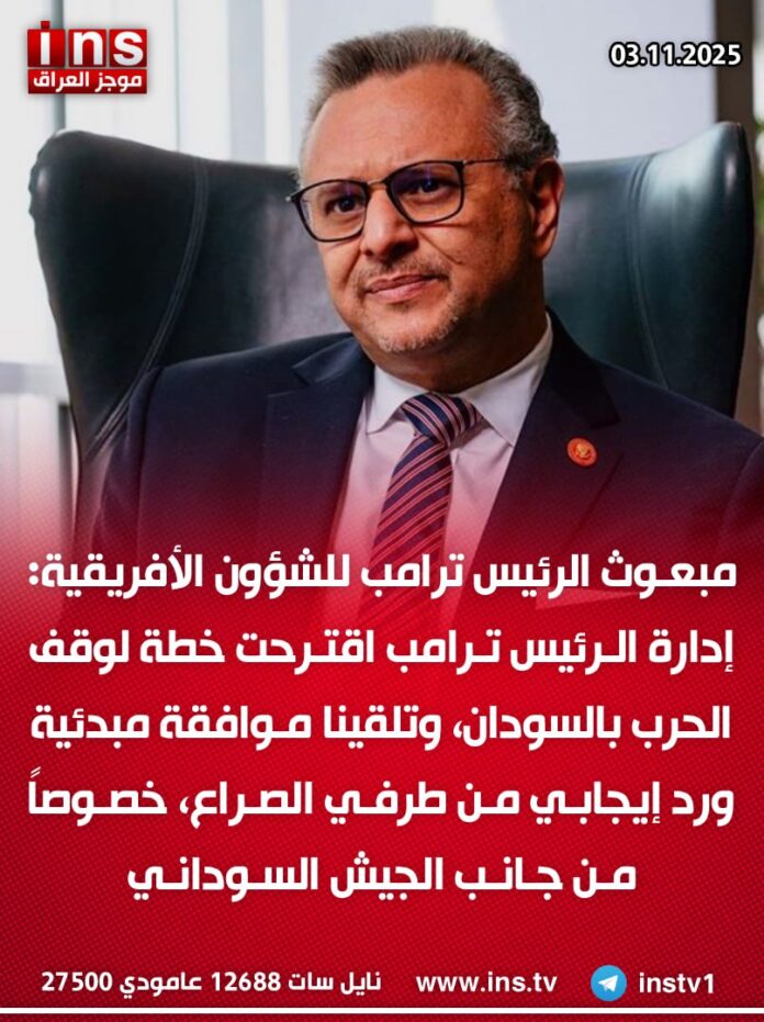 مبعوث الرئيس ترامب للشؤون الأفريقية: إدارة الرئيس ترامب اقترحت خطة لوقف الحرب بالسودان، وتلقينا موافقة مبدئية ورد إيجابي من طرفي الصراع، خصوصاً من جانب الجيش السوداني