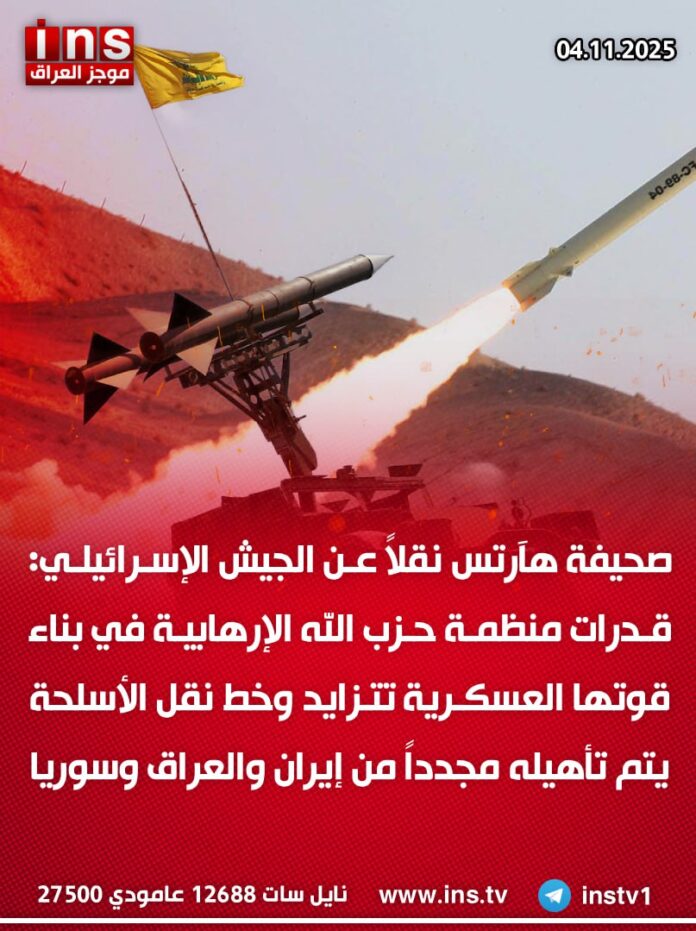 صحيفة هآرتس نقلاً عن الجيش الإسرائيلي: قدرات منظمة حزب الله الإرهابية في بناء قوتها العسكرية تتزايد وخط نقل الأسلحة لها يتم تأهيله مجدداً من إيران عبر العراق وسوريا