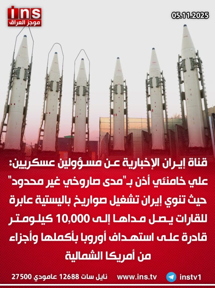 قناة إيران الإخبارية عن مسؤولين عسكريين: علي خامنئي أذن بـ”مدى صاروخي غير محدود” حيث تنوي إيران تشغيل صواريخ باليستية عابرة للقارات يصل مداها إلى 10,000 كيلومتر قادرة على استهداف أوروبا بأكملها وأجزاء من أمريكا الشمالية