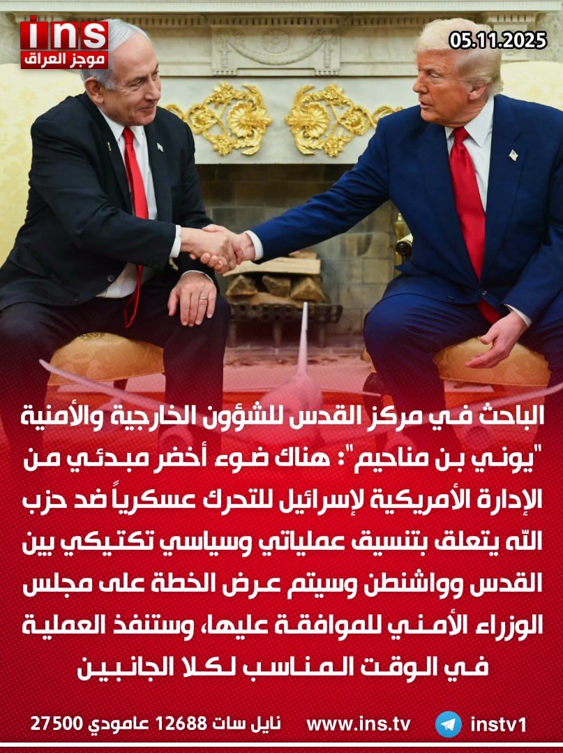 الباحث في مركز القدس للشؤون الخارجية والأمنية “يوني بن مناحيم”: هناك ضوء أخضر مبدئي من الإدارة الأمريكية لإسرائيل للتحرك عسكرياً ضد حزب الله يتعلق بتنسيق عملياتي وسياسي تكتيكي بين القدس وواشنطن وسيتم عرض الخطة على مجلس الوزراء الأمني للموافقة عليها، وستنفذ العملية في الوقت المناسب لكلا الجانبين