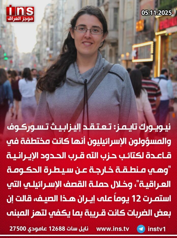 نيويورك تايمز: تعتقد إليزابيث تسوركوف والمسؤولون الإسرائيليون أنها كانت مختطفة في قاعدة لكتائب حزب الله قرب الحدود الإيرانية “وهي منطقة خارجة عن سيطرة الحكومة العراقية”، وخلال حملة القصف الإسرائيلي التي استمرت 12 يوماً على إيران هذا الصيف، قالت إن بعض الضربات كانت قريبة بما يكفي لتهز المبنى