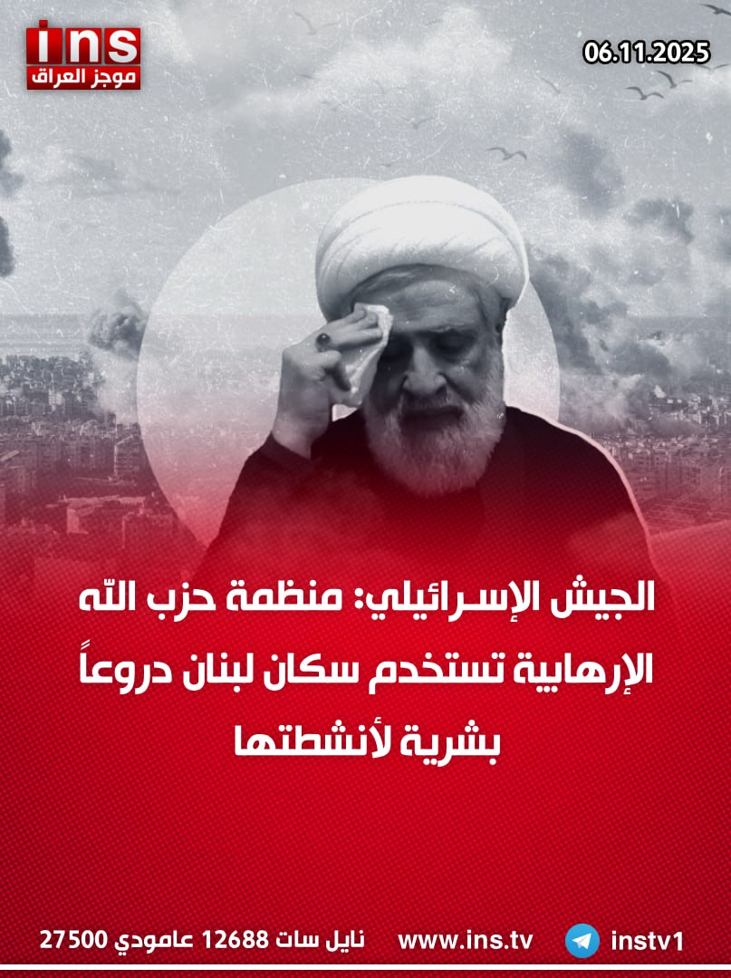 الرئيسيةالأخبارالجيش الإسرائيلي: منظمة حزب الله الإرهابية تستخدم سكان لبنان دروعاً بشرية لأنشطتها الأخبار الجيش الإسرائيلي: منظمة حزب الله الإرهابية تستخدم سكان لبنان دروعاً بشرية لأنشطتها 0 8 نوفمبر 6, 2025 كتب بواسطة موجز العراق ins شارك FacebookTwitterPinterestWhatsAppTelegramViberCopy URL شارك FacebookTwitterPinterestWhatsAppTelegramViberCopy URL مقالات ذات صلة الأخبار الجيش الإسرائيلي: منظمة حزب الله الإرهابية وضع مستودعات الأسلحة بين السكان المدنيين جنوب لبنان نوفمبر 6, 2025 الأخبار هيئة البث الإسرائيلية عن قادة في الجيش: موجة الغارات الأخيرة تهدف إلى تمكين إسرائيل من تحقيق هدفها بنزع سلاح منظمة حزب الله الإرهابية نوفمبر 6, 2025 الأخبار الخزانة الأمريكية: منذ يناير/كانون الثاني 2025 حول فيلق القدس التابع للحرس الثوري الإيراني والمدرج على قائمة العقوبات الأمريكية أكثر من مليار دولار أمريكي إلى... نوفمبر 6, 2025