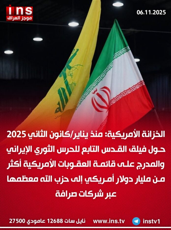 الخزانة الأمريكية: منذ يناير/كانون الثاني 2025 حول فيلق القدس التابع للحرس الثوري الإيراني والمدرج على قائمة العقوبات الأمريكية أكثر من مليار دولار أمريكي إلى حزب الله معظمها عبر شركات صرافة