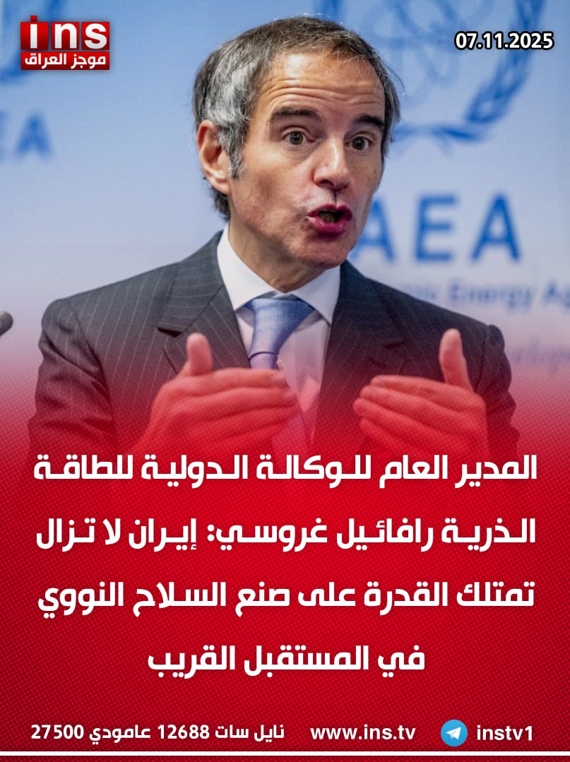 الرئيسيةالأخبارالمدير العام للوكالة الدولية للطاقة الذرية رافائيل غروسي: إيران لا تزال تمتلك... الأخبار المدير العام للوكالة الدولية للطاقة الذرية رافائيل غروسي: إيران لا تزال تمتلك القدرة على صنع السلاح النووي في المستقبل القريب 0 10 نوفمبر 7, 2025 كتب بواسطة موجز العراق ins شارك FacebookTwitterPinterestWhatsAppTelegramViberCopy URL شارك FacebookTwitterPinterestWhatsAppTelegramViberCopy URL مقالات ذات صلة الأخبار أجهزة الاستخبارات النمساوية تكتشف مستودع أسلحة في فيينا يشتبه في ارتباطه بحركة حماس الإرهابية كان معداً لشن هجمات إرهابية محتملة في أوروبا نوفمبر 7, 2025 الأخبار إيران تعلن عن اختبار صاروخ باليستي جديد عابر للقارات بمدى 10 آلاف كيلومتر قادر على ضرب الأراضي الأمريكية نوفمبر 7, 2025 الأخبار السفارة الأمريكية في بيروت: واشنطن ستستخدم كل الوسائل لمنع حزب الله من تهديد لبنان والمنطقة نوفمبر 7, 2025