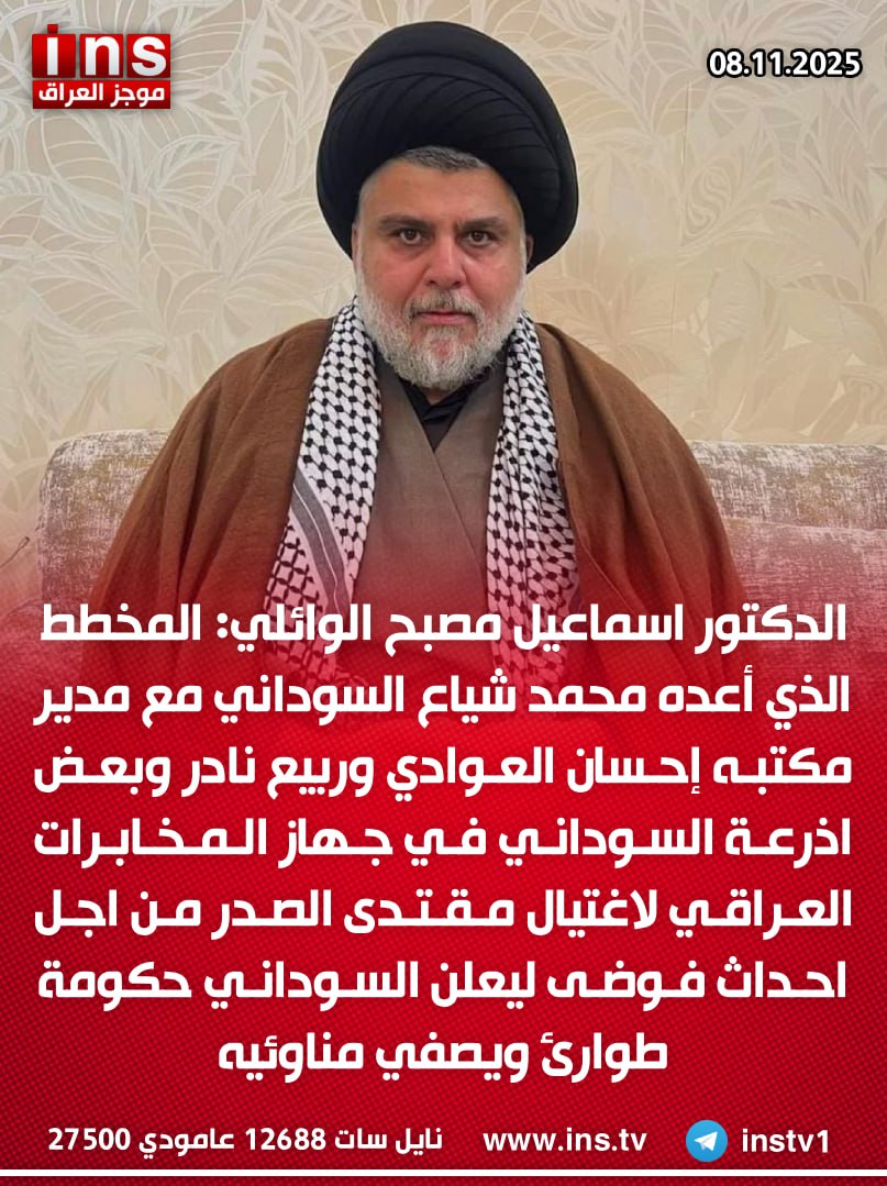 الدكتور اسماعيل مصبح الوائلي: المخطط الذي أعده محمد شياع السوداني مع مدير مكتبه إحسان العوادي وربيع نادر وبعض اذرعة السوداني في جهاز المخابرات العراقي لاغتيال مقتدى الصدر من اجل احداث فوضى ليعلن السوداني حكومة طوارئ ويصفي مناوئيه
