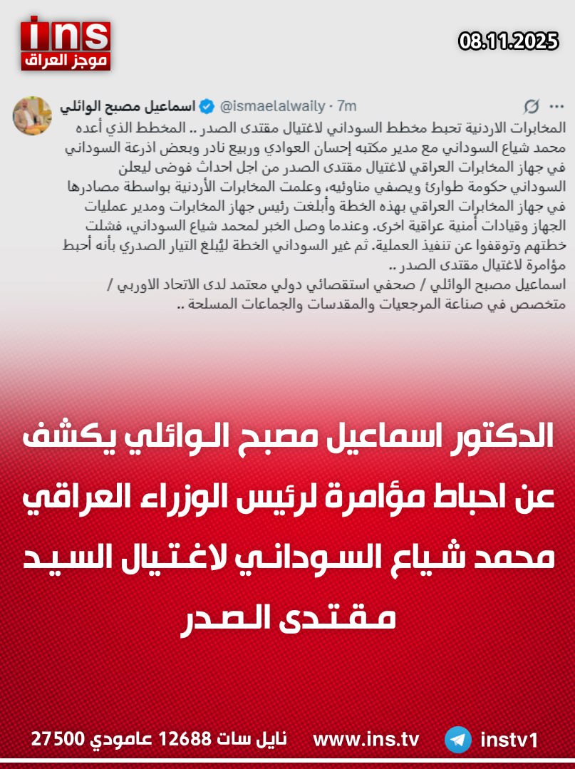 الرئيسيةالأخبارالدكتور اسماعيل مصبح الوائلي يكشف عن احباط مؤامرة لرئيس الوزراء العراقي محمد... الأخبار الدكتور اسماعيل مصبح الوائلي يكشف عن احباط مؤامرة لرئيس الوزراء العراقي محمد شياع السوداني لاغتيال السيد مقتدى الصدر 0 6 نوفمبر 8, 2025 كتب بواسطة موجز العراق ins شارك FacebookTwitterPinterestWhatsAppTelegramViberCopy URL شارك FacebookTwitterPinterestWhatsAppTelegramViberCopy URL مقالات ذات صلة الأخبار الدكتور اسماعيل مصبح الوائلي: المخطط الذي أعده محمد شياع السوداني مع مدير مكتبه إحسان العوادي وربيع نادر وبعض اذرعة السوداني في جهاز المخابرات العراقي... نوفمبر 8, 2025 الأخبار الدكتور اسماعيل مصبح الوائلي: المخابرات الاردنية تحبط مخطط السوداني لاغتيال مقتدى الصدر نوفمبر 8, 2025 الأخبار الدكتور اسماعيل مصبح الوائلي: المخابرات الاردنية تحبط مخطط السوداني لاغتيال مقتدى الصدر .. المخطط الذي أعده محمد شياع السوداني مع مدير مكتبه إحسان العوادي... نوفمبر 8, 2025