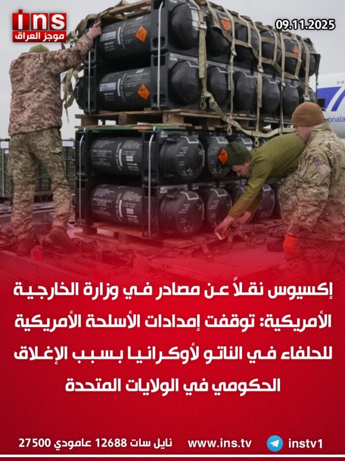 إكسيوس نقلاً عن مصادر في وزارة الخارجية الأمريكية: توقفت إمدادات الأسلحة الأمريكية للحلفاء في الناتو لأوكرانيا بسبب الإغلاق الحكومي في الولايات المتحدة