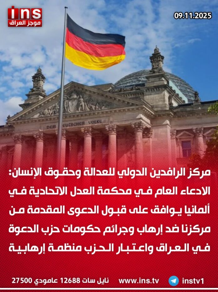 مركز الرافدين الدولي للعدالة وحقوق الإنسان: الادعاء العام في محكمة العدل الاتحادية في ألمانيا يوافق على قبول الدعوى المقدمة من مركزنا ضد إرهاب وجرائم حكومات حزب الدعوة في العراق واعتبار الحزب منظمة إرهابية