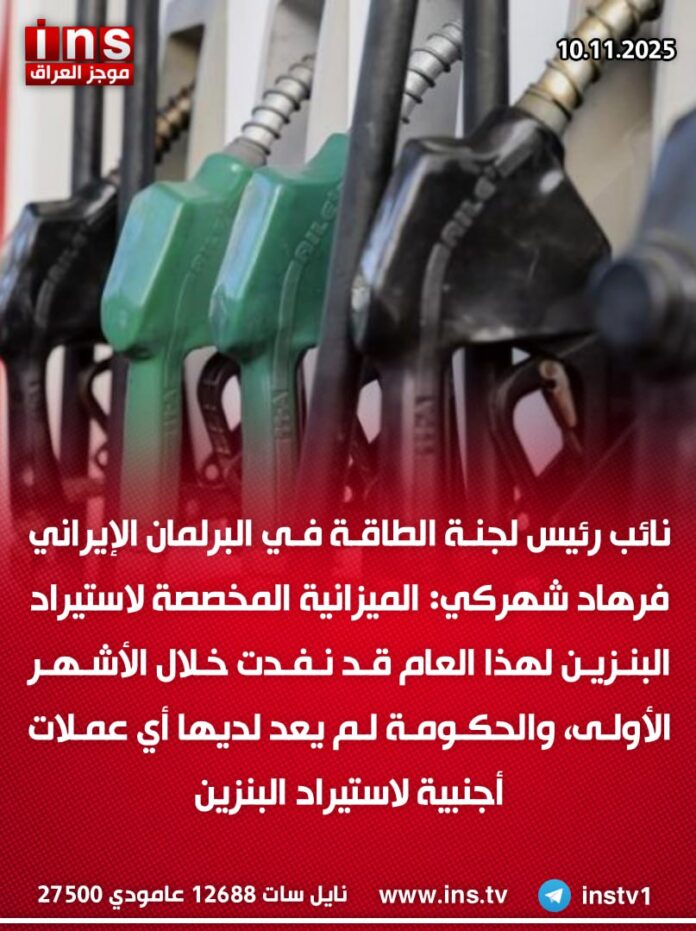 نائب رئيس لجنة الطاقة في البرلمان الإيراني فرهاد شهركي: الميزانية المخصصة لاستيراد البنزين لهذا العام قد نفدت خلال الأشهر الأولى، والحكومة لم يعد لديها أي عملات أجنبية لاستيراد البنزين