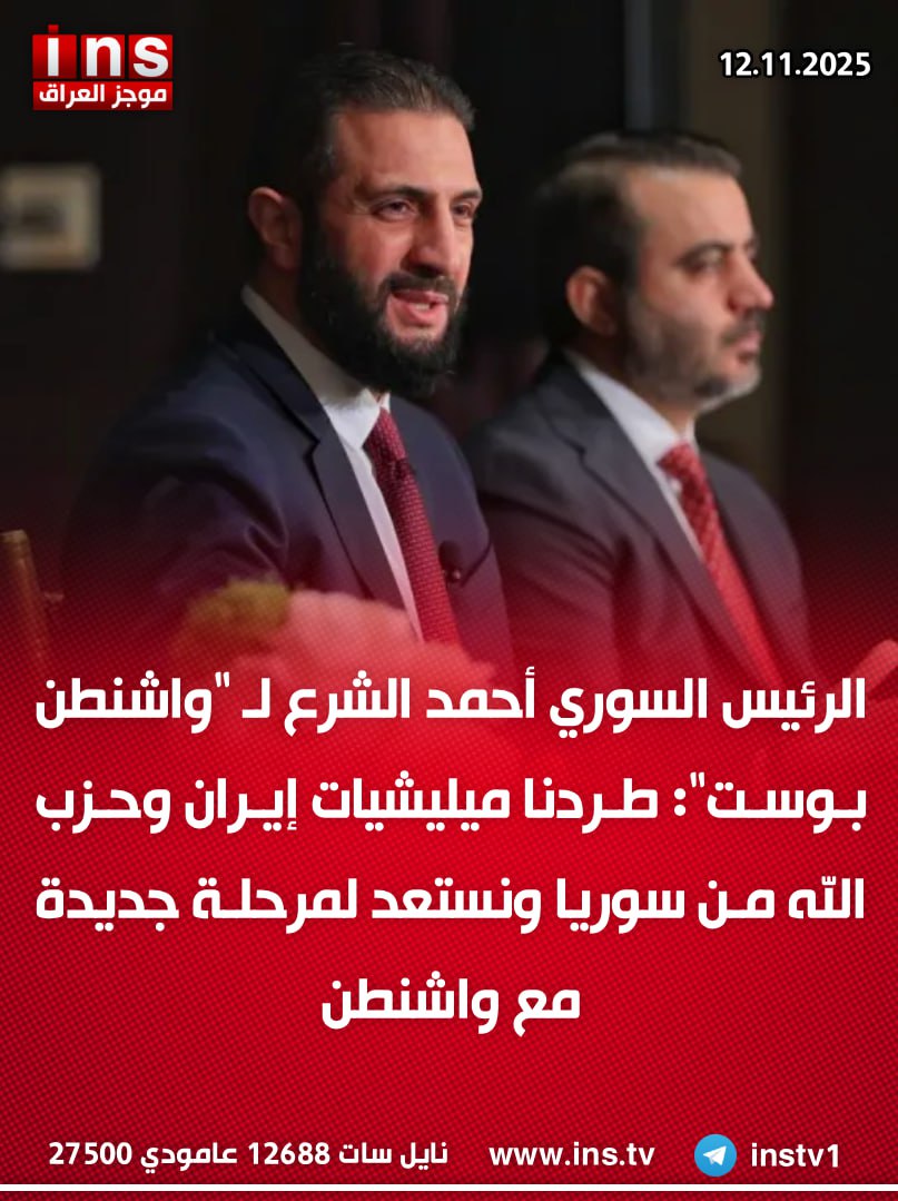 الرئيسيةالأخبارالرئيس السوري أحمد الشرع لـ "واشنطن بوست": طردنا ميليشيات إيران وحزب الله... الأخبار الرئيس السوري أحمد الشرع لـ “واشنطن بوست”: طردنا ميليشيات إيران وحزب الله من سوريا ونستعد لمرحلة جديدة مع واشنطن 0 6 نوفمبر 12, 2025 كتب بواسطة موجز العراق ins شارك FacebookTwitterPinterestWhatsAppTelegramViberCopy URL شارك FacebookTwitterPinterestWhatsAppTelegramViberCopy URL مقالات ذات صلة الأخبار الوكالة السويدية لحماية الطوائف الدينية تعلن قطع التمويل الحكومي عن مركز الإمام علي الإسلامي بعد ورود معلومات من جهاز الأمن السويدي “سيبو” بسبب استخدام... نوفمبر 12, 2025 الأخبار أستاذ العلوم السياسية في جامعة طهران “صادق زيباكلام”: إيران تستخدم المفاوضات كغطاء للمماطلة والسعي نحو امتلاك السلاح النووي نوفمبر 12, 2025 الأخبار رئيس بلدية طهران “مهدي جمران” يعلن بناء ملاجئ سرية في العاصمة الإيرانية استعداداً لحرب محتملة مع إسرائيل نوفمبر 12, 2025