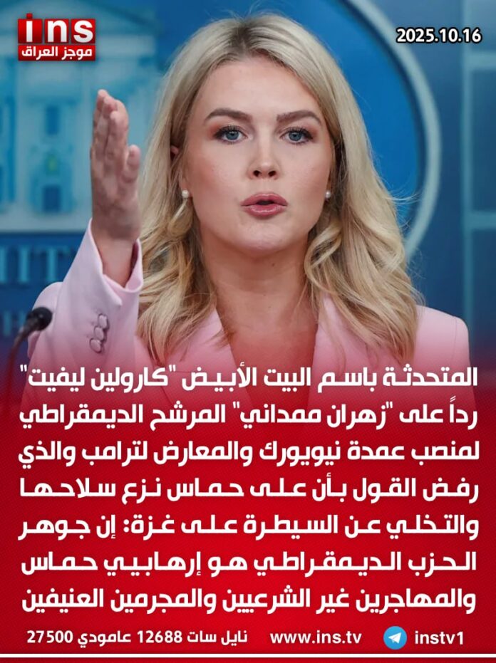 المتحدثة باسم البيت الأبيض “كارولين ليفيت” رداً على “زهران ممداني” المرشح الديمقراطي لمنصب عمدة نيويورك والمعارض لترامب والذي رفض القول بأن على حماس نزع سلاحها والتخلي عن السيطرة على غزة: إن جوهر الحزب الديمقراطي هو إرهابيي حماس والمهاجرين غير الشرعيين والمجرمين العنيفين