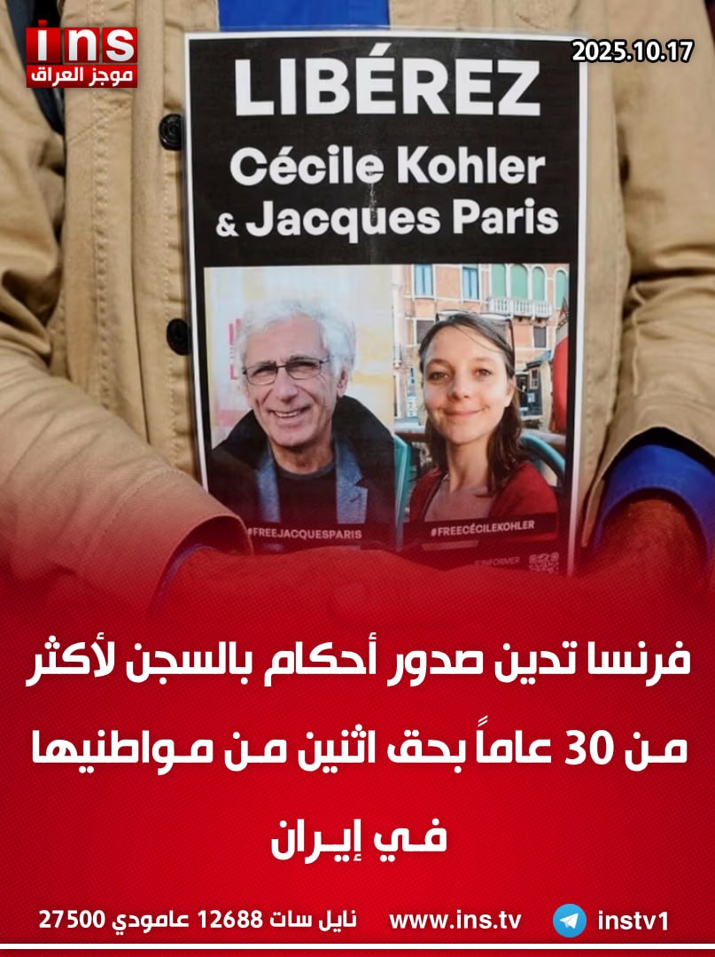الرئيسيةالأخبارفرنسا تدين صدور أحكام بالسجن لأكثر من 30 عاماً بحق اثنين من... الأخبار فرنسا تدين صدور أحكام بالسجن لأكثر من 30 عاماً بحق اثنين من مواطنيها في إيران 0 199 أكتوبر 16, 2025 كتب بواسطة موجز العراق ins شارك FacebookTwitterPinterestWhatsAppTelegramViberCopy URL شارك FacebookTwitterPinterestWhatsAppTelegramViberCopy URL مقالات ذات صلة الأخبار صحيفة فيرفيلد الأمريكية: مذكرة القبض بحق الرئيس ترامب التي اصدرها فائق زيدان لم تكن إجراءً قانونياً حقيقياً، بل رسالة سياسية تعزز مكانته داخل المحور... ديسمبر 27, 2025 الأخبار صحيفة فيرفيلد الأمريكية: أظهر فائق زيدان ولاءً رمزياً واضحاً لسليماني والمهندس، من خلال نصب تمثال للمهندس في منزله، وإصداره مذكرة توقيف بحق الرئيس الأمريكي... ديسمبر 27, 2025 الأخبار صحيفة فيرفيلد الأمريكية نقلاً عن ضابط رفيع في المخابرات العراقية: العراق خضع لسيطرة شبكة واحدة يقودها فائق زيدان، وهو الرجل الذي وضعته إيران في... ديسمبر 27, 2025