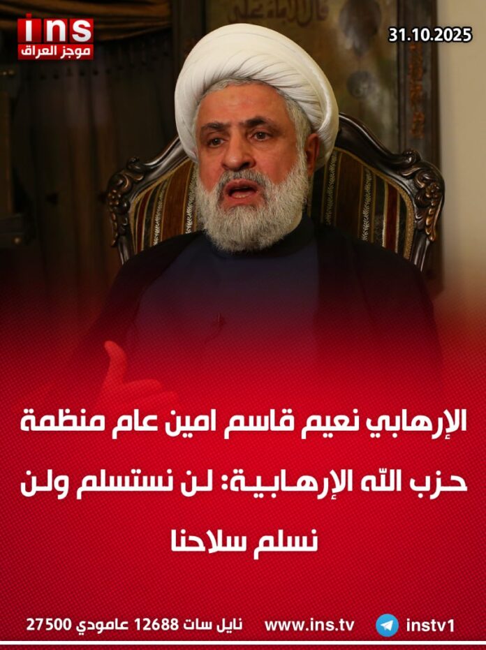 الرئيسيةالأخبارالإرهابي نعيم قاسم امين عام منظمة حزب الله الإرهابية: لن نستسلم ولن... الأخبار الإرهابي نعيم قاسم امين عام منظمة حزب الله الإرهابية: لن نستسلم ولن نسلم سلاحنا 0 60 أكتوبر 31, 2025 كتب بواسطة موجز العراق ins شارك FacebookTwitterPinterestWhatsAppTelegramViberCopy URL شارك FacebookTwitterPinterestWhatsAppTelegramViberCopy URL مقالات ذات صلة الأخبار رئيس أركان الجيش الإسرائيلي “إيال زامير” يلوح بهجوم جديد على إيران: إسرائيل ستضرب حيثما تقتضي الضرورة ديسمبر 21, 2025 الأخبار القائد السابق للقوة البحرية في الحرس الثوري الإيراني حسين علائي: البنية الاستخباراتية الإيرانية غير فاعلة في مواجهة إسرائيل ديسمبر 21, 2025 الأخبار الحكم بالحبس سنتين فقط بحق “سيف الوكيل” شريك المحامية قمر السامرائي بعد اختلاسه مبلغ وقدره 21 مليار دينار من صندوق تقاعد المحامين ديسمبر 21, 2025