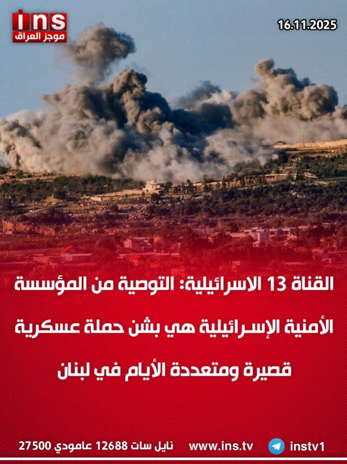 الرئيسيةالأخبارالقناة 13 الاسرائيلية: التوصية من المؤسسة الأمنية الإسرائيلية هي بشن حملة عسكرية... الأخبار القناة 13 الاسرائيلية: التوصية من المؤسسة الأمنية الإسرائيلية هي بشن حملة عسكرية قصيرة ومتعددة الأيام في لبنان 0 59 نوفمبر 16, 2025 كتب بواسطة موجز العراق ins شارك FacebookTwitterPinterestWhatsAppTelegramViberCopy URL شارك FacebookTwitterPinterestWhatsAppTelegramViberCopy URL مقالات ذات صلة الأخبار المحكمة الجزائية للولايات المتحدة الأمريكية تنشر إعلان استقدام بحق كل من رئيس مجلس القضاء الأعلى فائق زيدان ونوري كامل المالكي وولده أحمد نوري المالكي... ديسمبر 17, 2025 الأخبار الرئيس الأمريكي دونالد ترامب يعلن تصنيف النظام الفنزويلي كمنظمة إرهابية أجنبية ديسمبر 17, 2025 الأخبار سلاح الجو الإسرائيلي يستهدف مركبة تابعة لمنظمة حزب الله الإرهابية في قرية عديسة جنوب لبنان ديسمبر 16, 2025