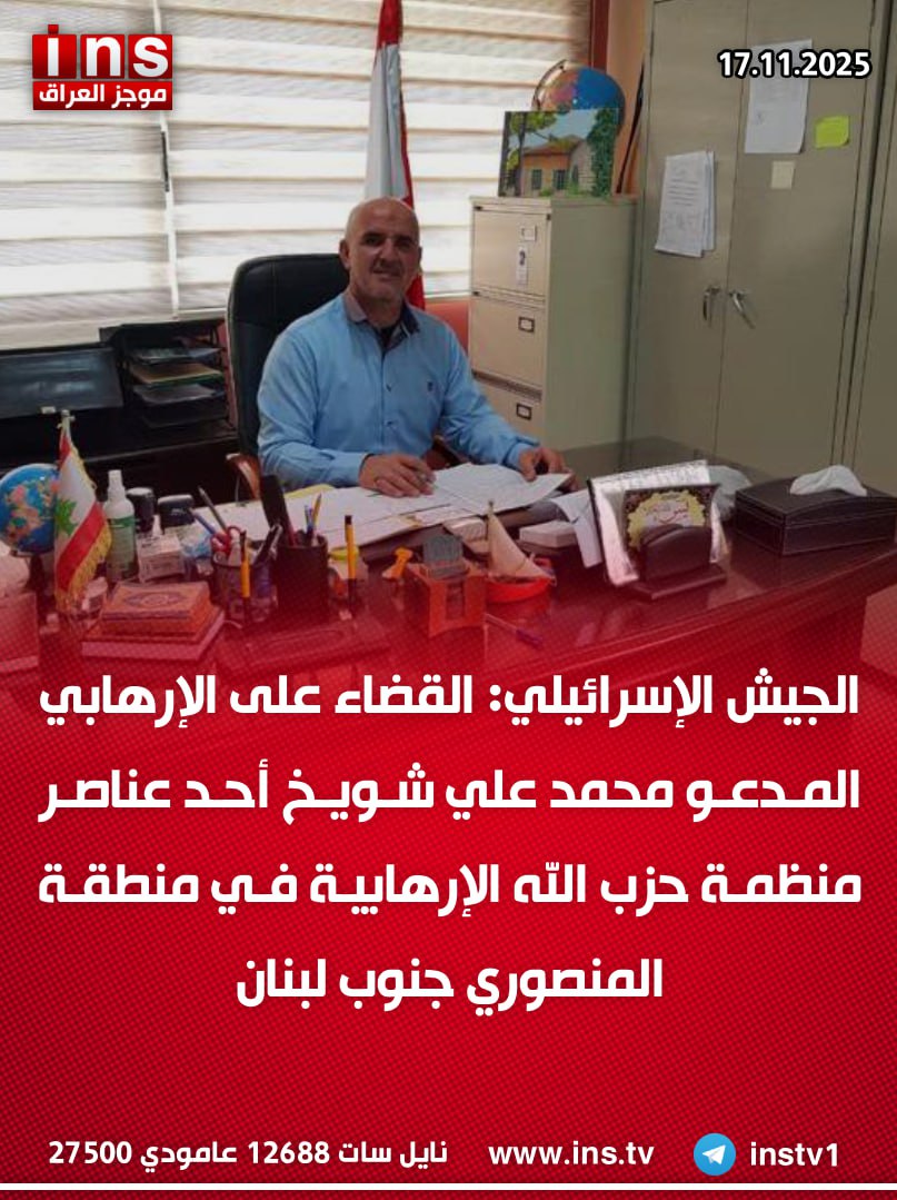 الرئيسيةالأخبارالجيش الإسرائيلي: القضاء على الإرهابي المدعو محمد علي شويخ أحد عناصر منظمة... الأخبار الجيش الإسرائيلي: القضاء على الإرهابي المدعو محمد علي شويخ أحد عناصر منظمة حزب الله الإرهابية في منطقة المنصوري جنوب لبنان 0 61 نوفمبر 17, 2025 كتب بواسطة موجز العراق ins شارك FacebookTwitterPinterestWhatsAppTelegramViberCopy URL شارك FacebookTwitterPinterestWhatsAppTelegramViberCopy URL مقالات ذات صلة الأخبار المحكمة الجزائية للولايات المتحدة الأمريكية تنشر إعلان استقدام بحق كل من رئيس مجلس القضاء الأعلى فائق زيدان ونوري كامل المالكي وولده أحمد نوري المالكي... ديسمبر 17, 2025 الأخبار الرئيس الأمريكي دونالد ترامب يعلن تصنيف النظام الفنزويلي كمنظمة إرهابية أجنبية ديسمبر 17, 2025 الأخبار سلاح الجو الإسرائيلي يستهدف مركبة تابعة لمنظمة حزب الله الإرهابية في قرية عديسة جنوب لبنان ديسمبر 16, 2025