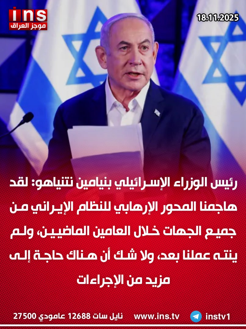 رئيس الوزراء الإسرائيلي بنيامين نتنياهو: لقد هاجمنا المحور الإرهابي للنظام الإيراني من جميع الجهات خلال العامين الماضيين، ولم ينته عملنا بعد، ولا شك أن هناك حاجة إلى مزيد من الإجراءات