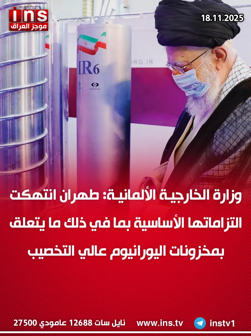 الرئيسيةالأخباروزارة الخارجية الألمانية: طهران انتهكت التزاماتها الأساسية بما في ذلك ما يتعلق... الأخبار وزارة الخارجية الألمانية: طهران انتهكت التزاماتها الأساسية بما في ذلك ما يتعلق بمخزونات اليورانيوم عالي التخصيب 0 61 نوفمبر 18, 2025 كتب بواسطة موجز العراق ins شارك FacebookTwitterPinterestWhatsAppTelegramViberCopy URL شارك FacebookTwitterPinterestWhatsAppTelegramViberCopy URL مقالات ذات صلة الأخبار المحكمة الجزائية للولايات المتحدة الأمريكية تنشر إعلان استقدام بحق كل من رئيس مجلس القضاء الأعلى فائق زيدان ونوري كامل المالكي وولده أحمد نوري المالكي... ديسمبر 17, 2025 الأخبار الرئيس الأمريكي دونالد ترامب يعلن تصنيف النظام الفنزويلي كمنظمة إرهابية أجنبية ديسمبر 17, 2025 الأخبار سلاح الجو الإسرائيلي يستهدف مركبة تابعة لمنظمة حزب الله الإرهابية في قرية عديسة جنوب لبنان ديسمبر 16, 2025