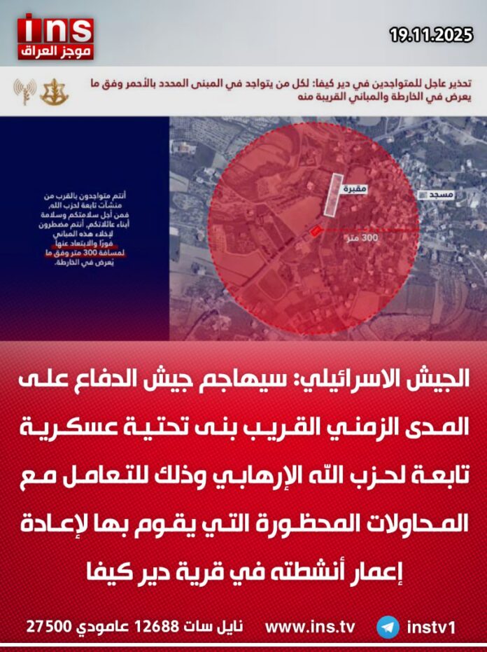 الجيش الاسرائيلي: سيهاجم جيش الدفاع على المدى الزمني القريب بنى تحتية عسكرية تابعة لحزب الله الإرهابي وذلك للتعامل مع المحاولات المحظورة التي يقوم بها لإعادة إعمار أنشطته في قرية دير كيفا