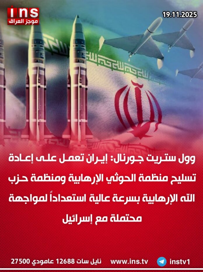 الرئيسيةالأخباروول ستريت جورنال: إيران تعمل على إعادة تسليح منظمة الحوثي الإرهابية ومنظمة... الأخبار وول ستريت جورنال: إيران تعمل على إعادة تسليح منظمة الحوثي الإرهابية ومنظمة حزب الله الإرهابية بسرعة عالية استعداداً لمواجهة محتملة مع إسرائيل 0 44 نوفمبر 19, 2025 كتب بواسطة موجز العراق ins شارك FacebookTwitterPinterestWhatsAppTelegramViberCopy URL شارك FacebookTwitterPinterestWhatsAppTelegramViberCopy URL مقالات ذات صلة الأخبار سلاح الجو الإسرائيلي يستهدف مركبة تابعة لمنظمة حزب الله الإرهابية في قرية عديسة جنوب لبنان ديسمبر 16, 2025 الأخبار الدكتور بربوتي رئيس هيئة العلاقات الخارجية للمجلس الوطني للمعارضة العراقية، بدعوة رسمية يسلم السيناتور جو ويلسون في مكتبه بالكونغرس رسالة البروفيسور عبدالناصر الجنابي للرئيس... ديسمبر 16, 2025 الأخبار وزير الخارجية العراقي فؤاد حسين: الولايات المتحدة ترفض مشاركة الفصائل في الحكومة القادمة ديسمبر 16, 2025