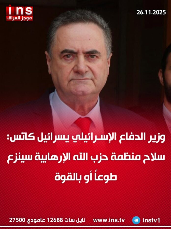 الرئيسيةالأخباروزير الدفاع الإسرائيلي يسرائيل كاتس: سلاح منظمة حزب الله الإرهابية سينزع طوعاً... الأخبار وزير الدفاع الإسرائيلي يسرائيل كاتس: سلاح منظمة حزب الله الإرهابية سينزع طوعاً أو بالقوة 0 116 نوفمبر 26, 2025 كتب بواسطة موجز العراق ins شارك FacebookTwitterPinterestWhatsAppTelegramViberCopy URL شارك FacebookTwitterPinterestWhatsAppTelegramViberCopy URL مقالات ذات صلة الأخبار صحيفة فيرفيلد الأمريكية: مذكرة القبض بحق الرئيس ترامب التي اصدرها فائق زيدان لم تكن إجراءً قانونياً حقيقياً، بل رسالة سياسية تعزز مكانته داخل المحور... ديسمبر 27, 2025 الأخبار صحيفة فيرفيلد الأمريكية: أظهر فائق زيدان ولاءً رمزياً واضحاً لسليماني والمهندس، من خلال نصب تمثال للمهندس في منزله، وإصداره مذكرة توقيف بحق الرئيس الأمريكي... ديسمبر 27, 2025 الأخبار صحيفة فيرفيلد الأمريكية نقلاً عن ضابط رفيع في المخابرات العراقية: العراق خضع لسيطرة شبكة واحدة يقودها فائق زيدان، وهو الرجل الذي وضعته إيران في... ديسمبر 27, 2025