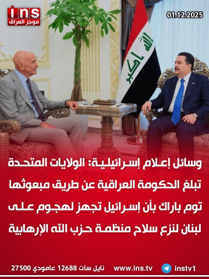 وسائل إعلام إسرائيلية: الولايات المتحدة تبلغ الحكومة العراقية عن طريق مبعوثها توم باراك بأن إسرائيل تجهز لهجوم على لبنان لنزع سلاح منظمة حزب الله الإرهابية