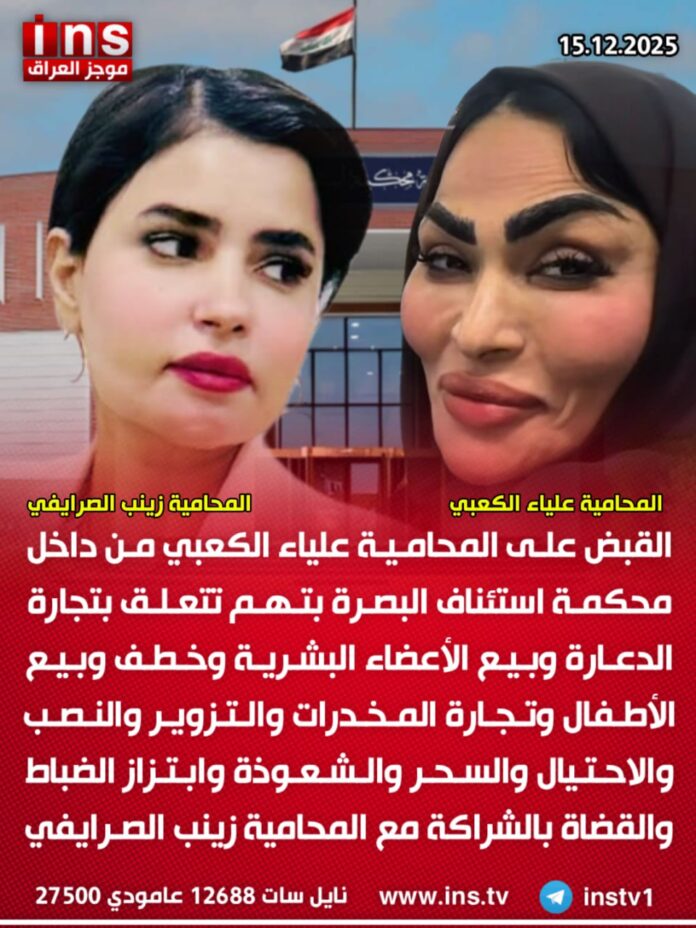 القبض على المحامية علياء الكعبي من داخل محكمة استئناف البصرة بتهم تتعلق بتجارة الدعارة وبيع الأعضاء البشرية وخطف وبيع الأطفال وتجارة المخدرات والتزوير والنصب والاحتيال والسحر والشعوذة وابتزاز الضباط والقضاة بالشراكة مع المحامية زينب الصرايفي