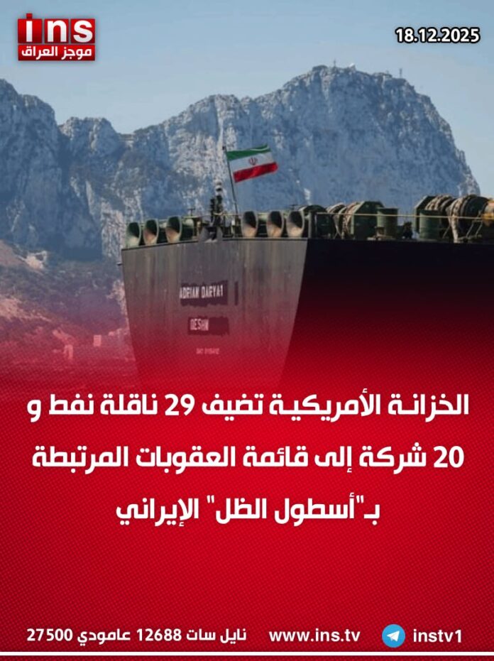 الرئيسيةالأخبارالخزانة الأمريكية تضيف 29 ناقلة نفط و20 شركة إلى قائمة العقوبات المرتبطة... الأخبار الخزانة الأمريكية تضيف 29 ناقلة نفط و20 شركة إلى قائمة العقوبات المرتبطة بـ”أسطول الظل” الإيراني 0 8 ديسمبر 18, 2025 كتب بواسطة موجز العراق ins شارك FacebookTwitterPinterestWhatsAppTelegramViberCopy URL شارك FacebookTwitterPinterestWhatsAppTelegramViberCopy URL مقالات ذات صلة الأخبار النائب باسم خشان: نور زهير افرجت المحكمة عنه بكفالة لا تساوي خردة بالنسبة للأموال التي سرقها، وهرب من العراق بعد رفع الحجز عن أمواله... ديسمبر 18, 2025 الأخبار وزير الخارجية الإسرائيلي جدعون ساعر: إيران لا تزال تسعى إلى امتلاك سلاح نووي ونظامها يهدد استقرار المنطقة ديسمبر 18, 2025 الأخبار النائب باسم خشان: الحرب ضد الفساد يجب أن تبدأ بمعركة ضد القضاء ديسمبر 18, 2025