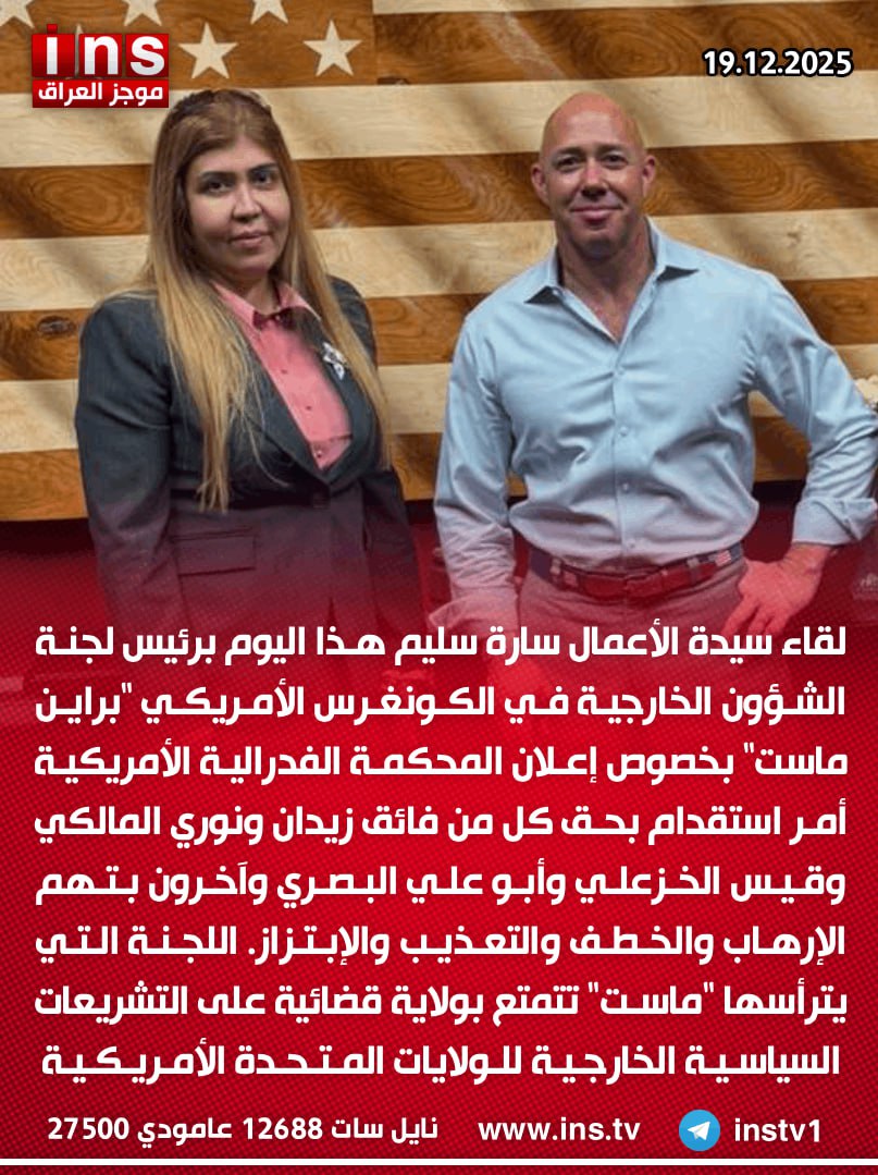 لقاء سيدة الأعمال سارة سليم هذا اليوم برئيس لجنة الشؤون الخارجية في الكونغرس الأمريكي “براين ماست” بخصوص إعلان المحكمة الفدرالية الأمريكية أمر استقدام بحق كل من فائق زيدان ونوري المالكي وقيس الخزعلي وأبو علي البصري وآخرون بتهم الإرهاب والخطف والتعذيب والإبتزاز. اللجنة التي يترأسها “ماست” تتمتع بولاية قضائية على التشريعات السياسية الخارجية للولايات المتحدة الأمريكية
