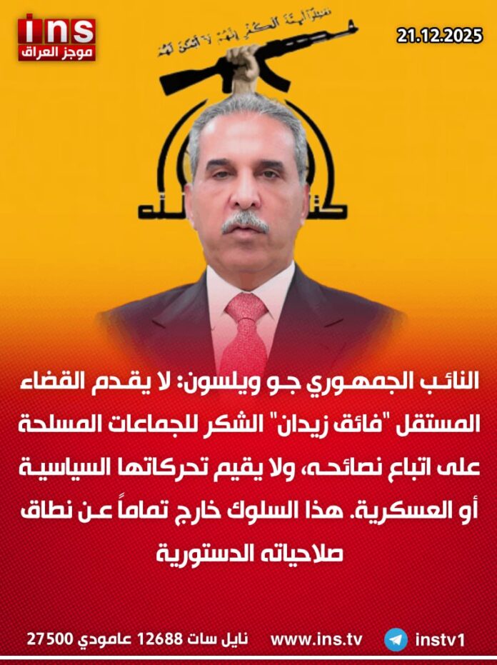 النائب الجمهوري جو ويلسون: لا يقدم القضاء المستقل “فائق زيدان” الشكر للجماعات المسلحة على اتباع نصائحه، ولا يقيم تحركاتها السياسية أو العسكرية. هذا السلوك خارج تماماً عن نطاق صلاحياته الدستورية