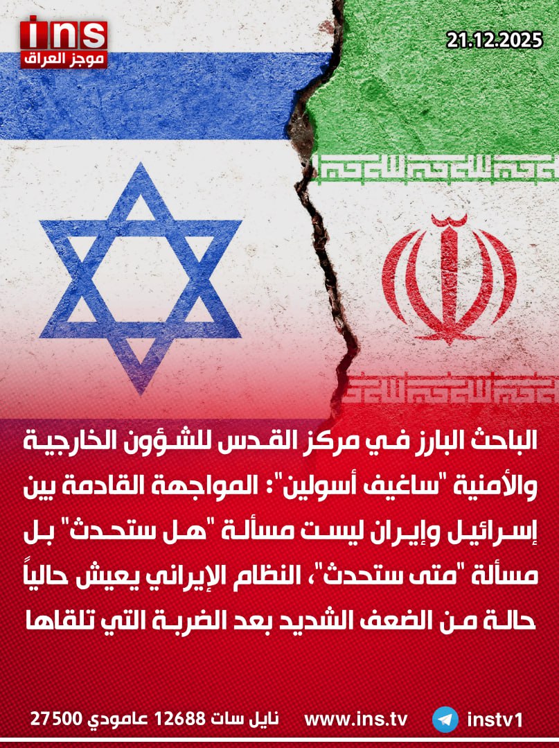 الباحث البارز في مركز القدس للشؤون الخارجية والأمنية “ساغيف أسولين”: المواجهة القادمة بين إسرائيل وإيران ليست مسألة “هل ستحدث” بل مسألة “متى ستحدث”، النظام الإيراني يعيش حالياً حالة من الضعف الشديد بعد الضربة التي تلقاها