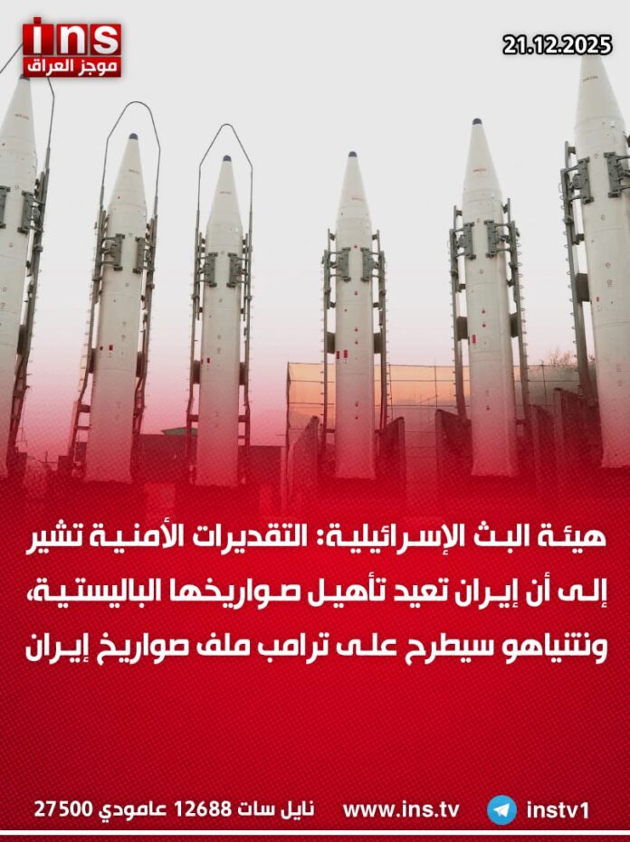 الرئيسيةالأخبارهيئة البث الإسرائيلية: التقديرات الأمنية تشير إلى أن إيران تعيد تأهيل صواريخها... الأخبار هيئة البث الإسرائيلية: التقديرات الأمنية تشير إلى أن إيران تعيد تأهيل صواريخها الباليستية، ونتنياهو سيطرح على ترامب ملف صواريخ إيران 0 5 ديسمبر 21, 2025 كتب بواسطة موجز العراق ins شارك FacebookTwitterPinterestWhatsAppTelegramViberCopy URL شارك FacebookTwitterPinterestWhatsAppTelegramViberCopy URL مقالات ذات صلة الأخبار هيئة البث الإسرائيلية: نتنياهو أجرى مشاورات أمنية بشأن إيران قبل السفر الى أمريكا ديسمبر 21, 2025 الأخبار النائب باسم خشان: رئيس مجلس القضاء الاعلى يوصل رسالة الى الأمريكيين أنه وراء موافقة الأحزاب المسلحة على نزع سلاحها، وهذه الرسالة ليست موجهة الى... ديسمبر 21, 2025 الأخبار رئيس أركان الجيش الإسرائيلي “إيال زامير” يلوح بهجوم جديد على إيران: إسرائيل ستضرب حيثما تقتضي الضرورة ديسمبر 21, 2025