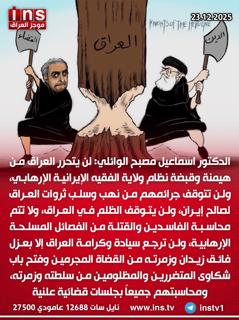 الدكتور اسماعيل مصبح الوائلي: لن يتحرر العراق من هيمنة وقبضة نظام ولاية الفقيه الإيرانية الإرهابي، ولن تتوقف جرائمهم من نهب وسلب ثروات العراق لصالح إيران، ولن يتوقف الظلم في العراق، ولا تتم محاسبة الفاسدين والقتلة من الفصائل المسلحة الإرهابية، ولن ترجع سيادة وكرامة العراق إلا بعزل فائق زيدان وزمرته من القضاة المجرمين وفتح باب شكاوى المتضررين والمظلومين من سلطته وزمرته، ومحاسبتهم جميعاً بجلسات قضائية علنية