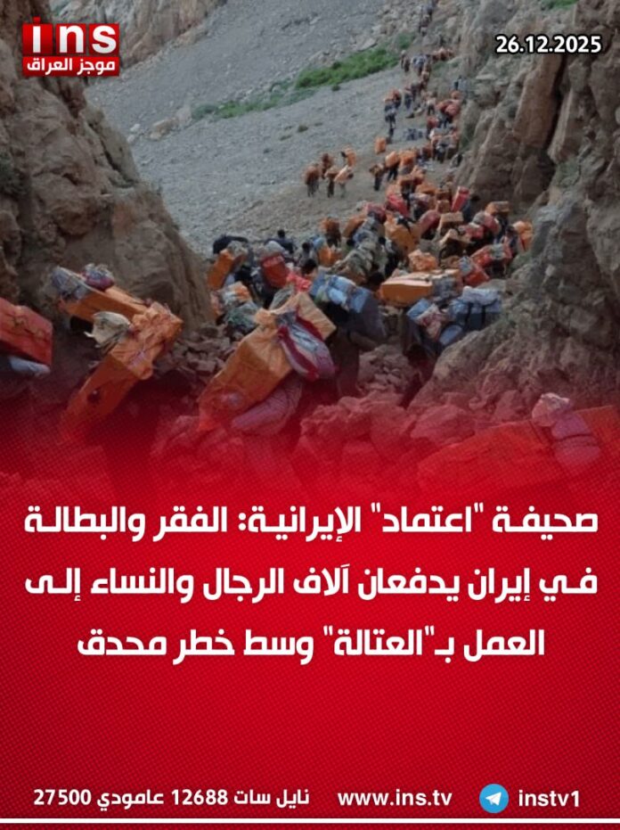 الرئيسيةالأخبارصحيفة "اعتماد" الإيرانية: الفقر والبطالة في إيران يدفعان آلاف الرجال والنساء إلى... الأخبار صحيفة “اعتماد” الإيرانية: الفقر والبطالة في إيران يدفعان آلاف الرجال والنساء إلى العمل بـ”العتالة” وسط خطر محدق 0 60 ديسمبر 26, 2025 كتب بواسطة موجز العراق ins شارك FacebookTwitterPinterestWhatsAppTelegramViberCopy URL شارك FacebookTwitterPinterestWhatsAppTelegramViberCopy URL مقالات ذات صلة الأخبار صحيفة فيرفيلد الأمريكية: مذكرة القبض بحق الرئيس ترامب التي اصدرها فائق زيدان لم تكن إجراءً قانونياً حقيقياً، بل رسالة سياسية تعزز مكانته داخل المحور... ديسمبر 27, 2025 الأخبار صحيفة فيرفيلد الأمريكية: أظهر فائق زيدان ولاءً رمزياً واضحاً لسليماني والمهندس، من خلال نصب تمثال للمهندس في منزله، وإصداره مذكرة توقيف بحق الرئيس الأمريكي... ديسمبر 27, 2025 الأخبار صحيفة فيرفيلد الأمريكية نقلاً عن ضابط رفيع في المخابرات العراقية: العراق خضع لسيطرة شبكة واحدة يقودها فائق زيدان، وهو الرجل الذي وضعته إيران في... ديسمبر 27, 2025