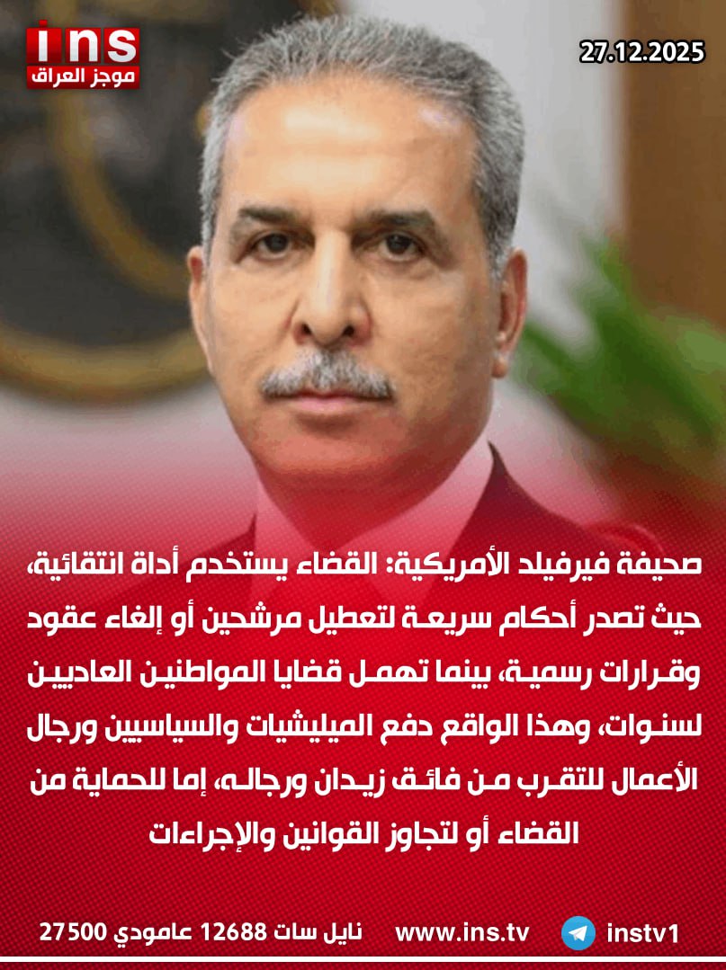 صحيفة فيرفيلد الأمريكية: القضاء يستخدم أداة انتقائية، حيث تصدر أحكام سريعة لتعطيل مرشحين أو إلغاء عقود وقرارات رسمية، بينما تهمل قضايا المواطنين العاديين لسنوات، وهذا الواقع دفع الميليشيات والسياسيين ورجال الأعمال للتقرب من فائق زيدان ورجاله، إما للحماية من القضاء أو لتجاوز القوانين والإجراءات
