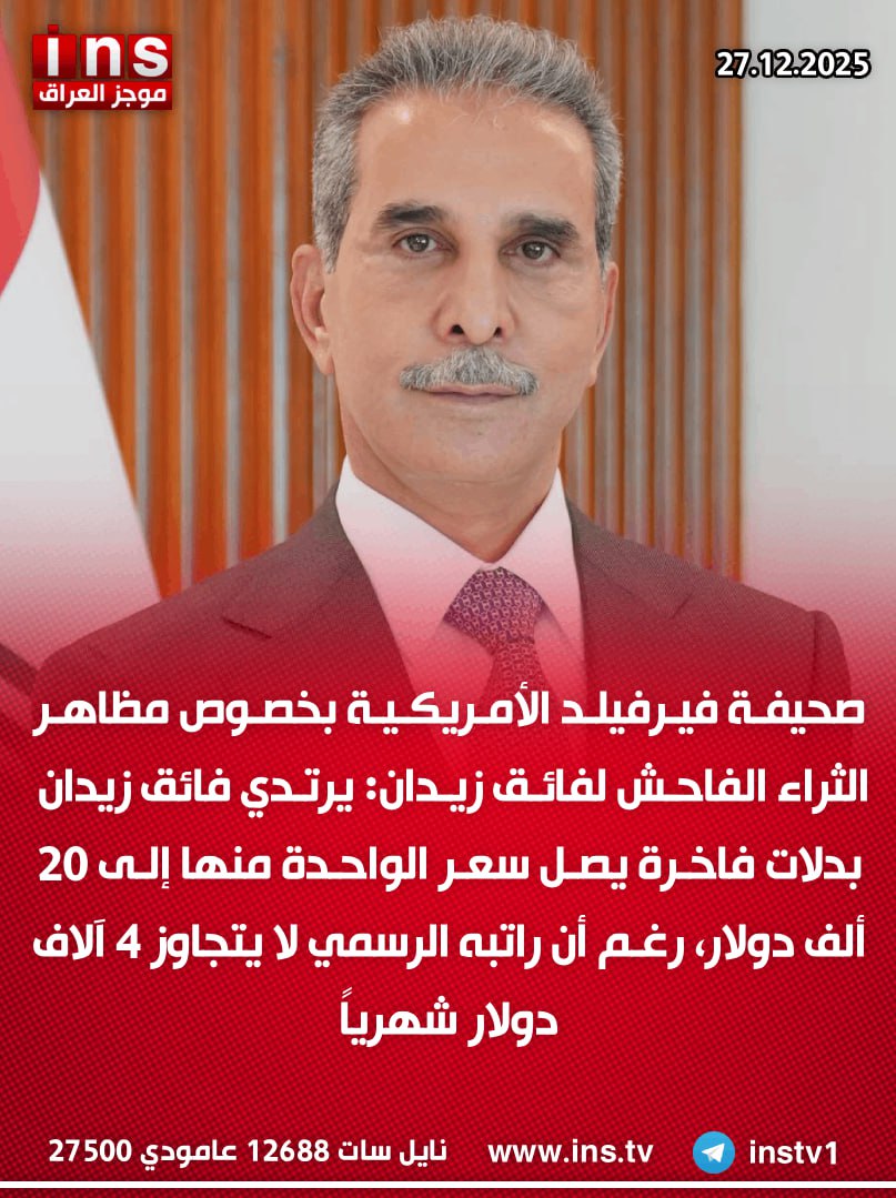 صحيفة فيرفيلد الأمريكية بخصوص مظاهر الثراء الفاحش لفائق زيدان: يرتدي فائق زيدان بدلات فاخرة يصل سعر الواحدة منها إلى 20 ألف دولار، رغم أن راتبه الرسمي لا يتجاوز 4 آلاف دولار شهرياً