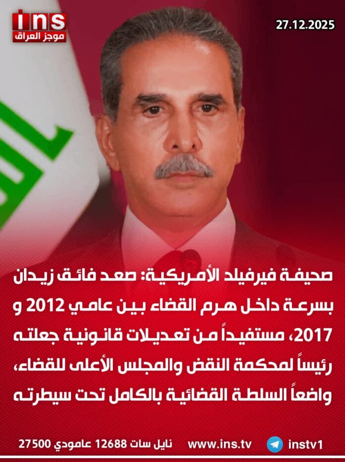 صحيفة فيرفيلد الأمريكية: صعد فائق زيدان بسرعة داخل هرم القضاء بين عامي 2012 و2017، مستفيداً من تعديلات قانونية جعلته رئيساً لمحكمة النقض والمجلس الأعلى للقضاء، واضعاً السلطة القضائية بالكامل تحت سيطرته